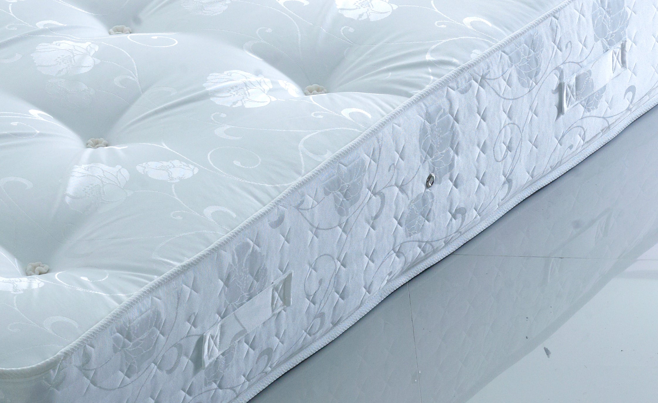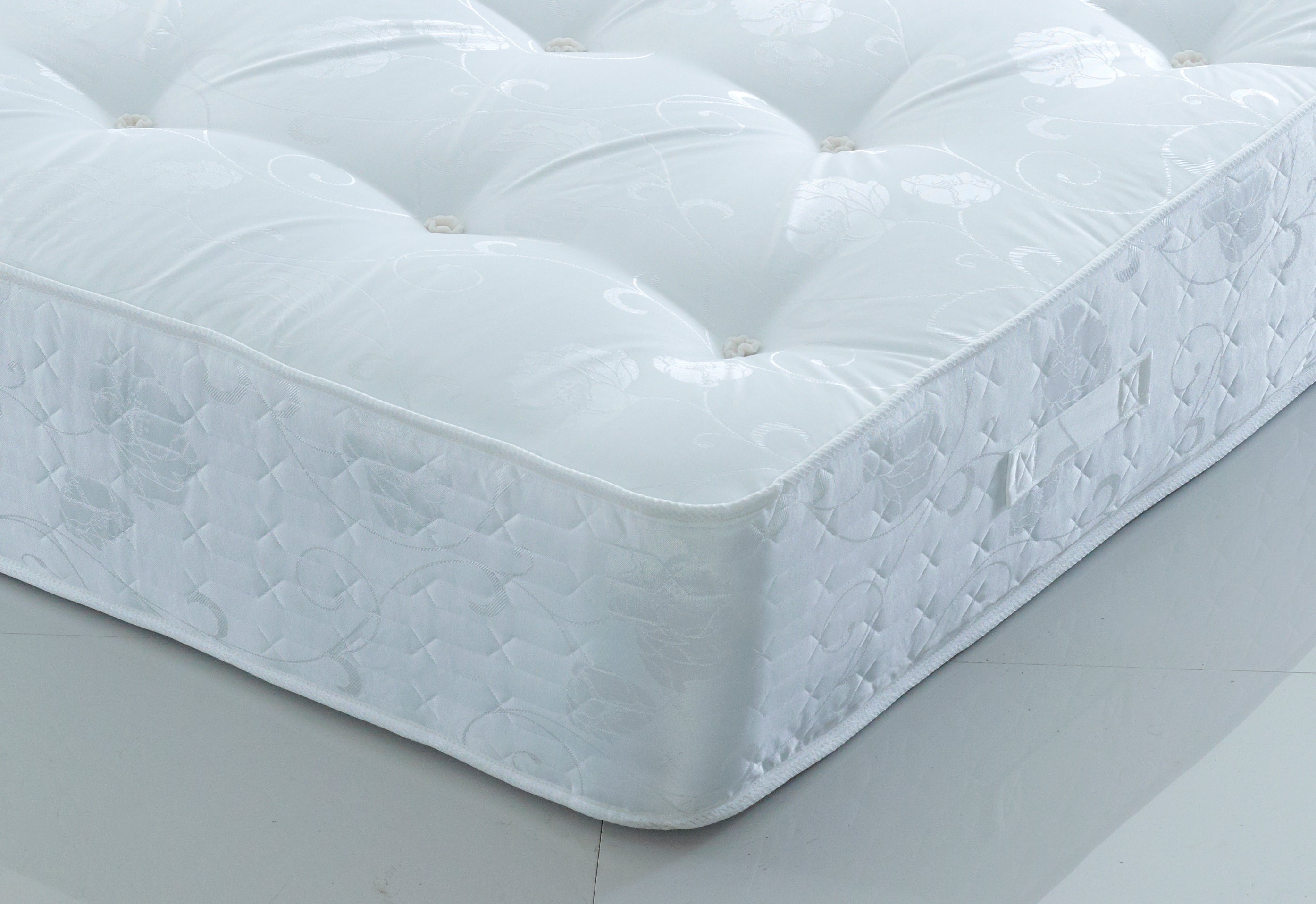 The Dorset Mattress offers a firm rating, providing exceptional orthopaedic support with its 12.5-gauge open coil spring system. Designed for those who need extra support, it features a damask fabric and micro-quilted border for a smooth finish. The dual-sided mattress ensures long-lasting durability and is hand tufted for added strength. Perfect for those seeking a firm, supportive mattress with a classic, durable design.