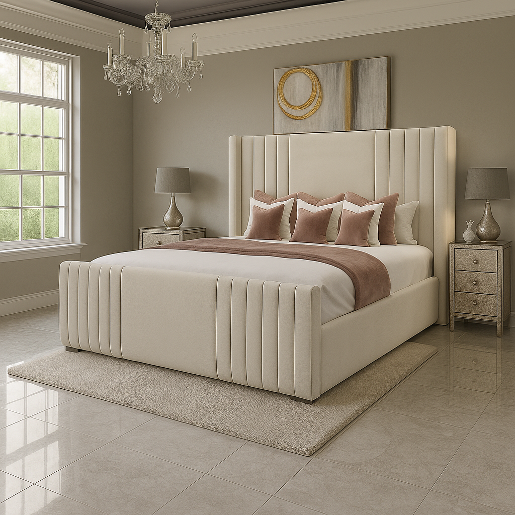 The Valencia Winged Bed Frame is the ultimate statement of modern elegance and luxurious comfort. Featuring a tall, winged headboard with deep vertical panels that continue seamlessly into the footboard, this design exudes sophistication and grandeur. The winged sides not only add a touch of drama but also create a cosy, enveloping feel — perfect for relaxing in style.